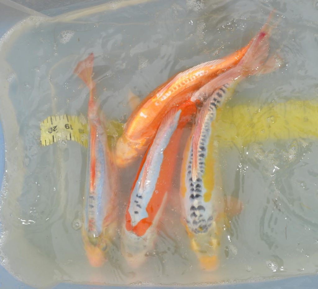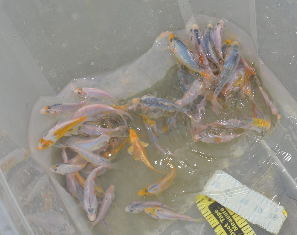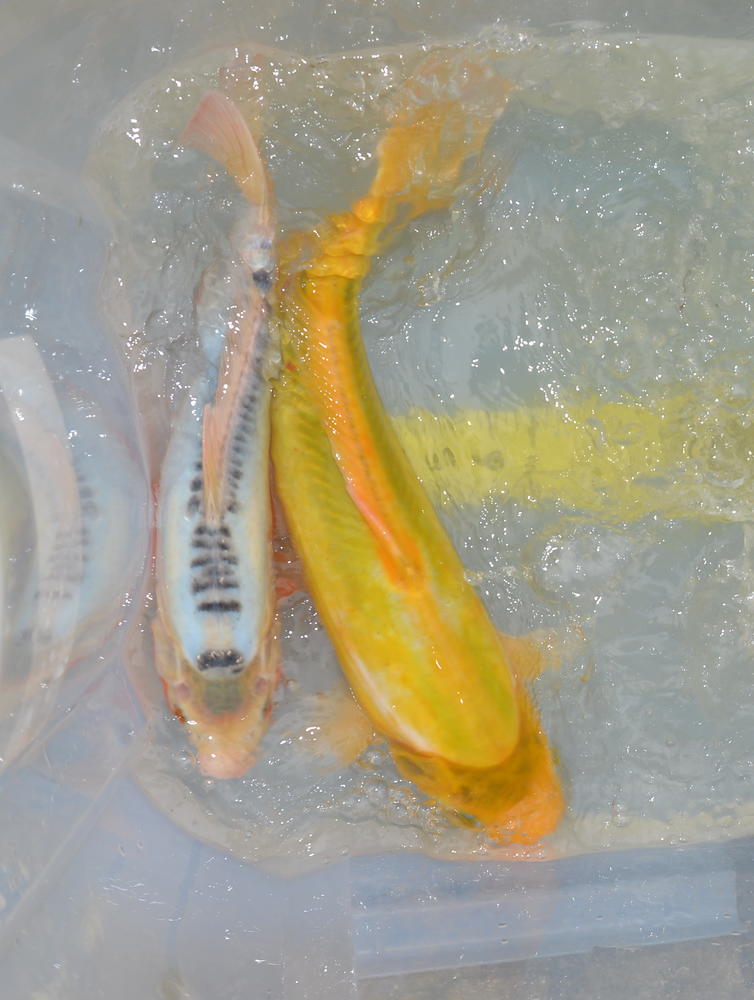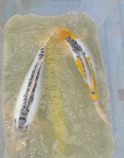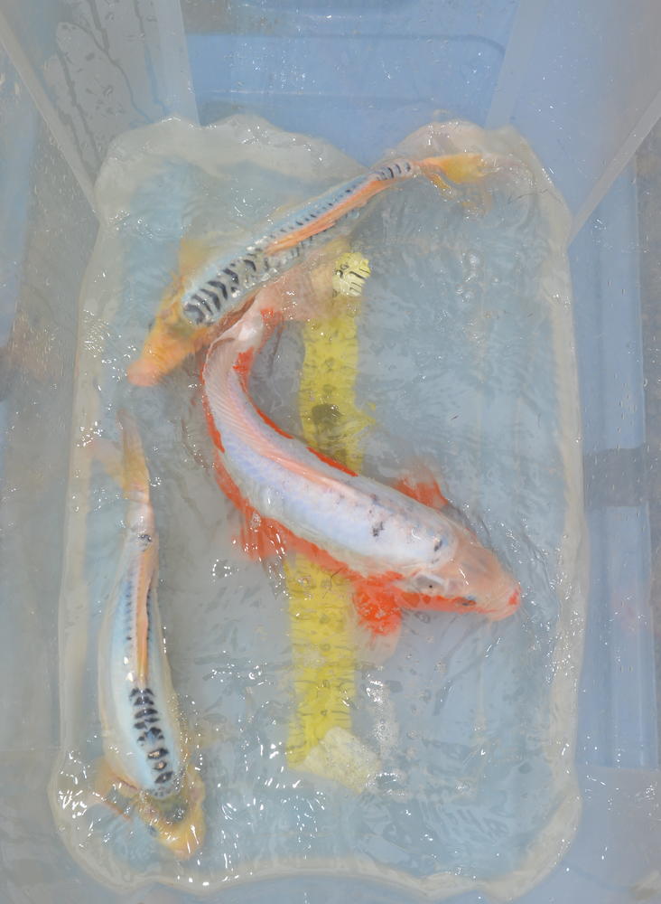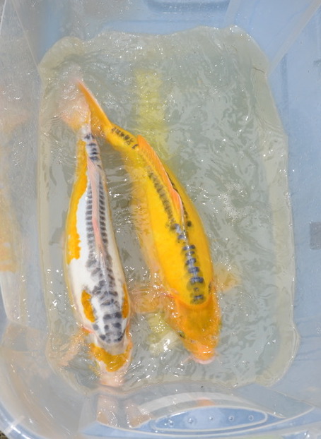 It was a really terrific day. The F1 oyagoi who spawned in May looked wonderful so they live to spawn again. The fish in these nets are ki shusui, ki asagi, midori, ayawakaba, doitsu ogon, one hariwake, and muttagoi from the resulting flock spawns.