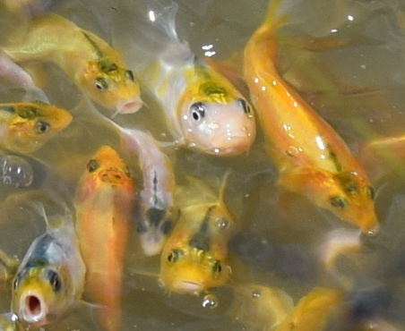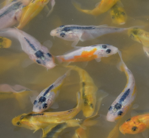 After the tiny fry, see them at five weeks old. They are thriving on a diet of pond life and freeze-dried plankton. The koi of special interest are the ones with the black dot on their foreheads. This is called "chobo sumi" or small black. This shows shusui/asagi traits. The white ones with yellow markings are showing early signs of becoming ki shusui (!) The yellow/greenish ones with chobo sumi will likely be midori. Gray will likely be asagi.