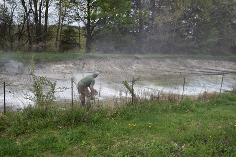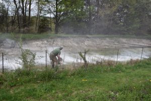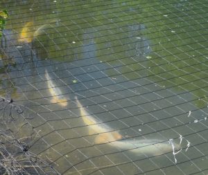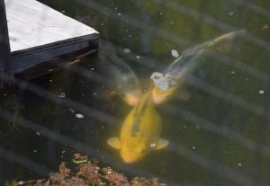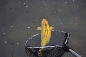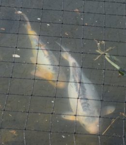3. On May 10, 2017, John dusted the Lower Pond with hydrated lime to kill bad bugs and refilled with 150,000 gallons of fresh well water. We inspected the oyagoi and swapped out one female who was aging not so well and substituted her for a gold shusui midori, a sibling of the others from the 2012 spawn.