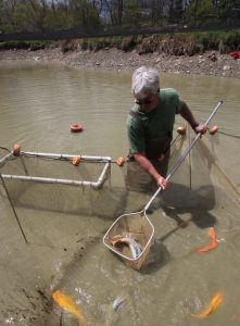 ~~ Pictures below: Catching parent fish (oyagoi) from the Big Pond; after draining, liming the nursery pond, then, releasing parents into freshly cleaned and refilled Lower Pond, which is the nursery.